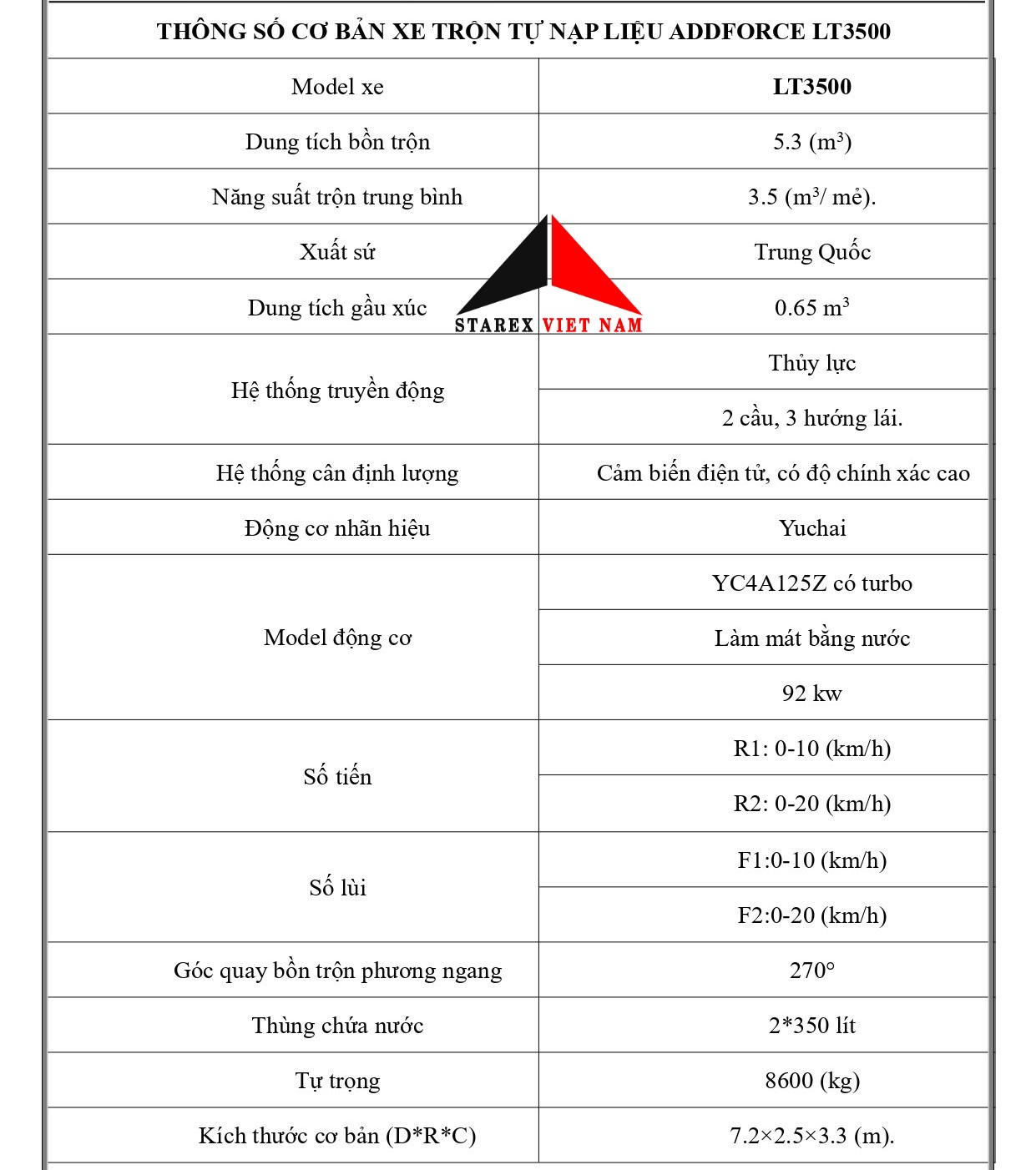 Chúng tôi xin giới thiệu Xe Trộn Bê Tông Tự Nạp Liệu 5.3m3 ADDFORCE LT3500, năng suất 3,5m3/mẻ/10-15 phút: